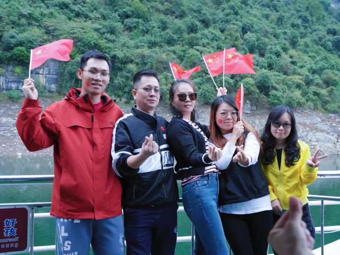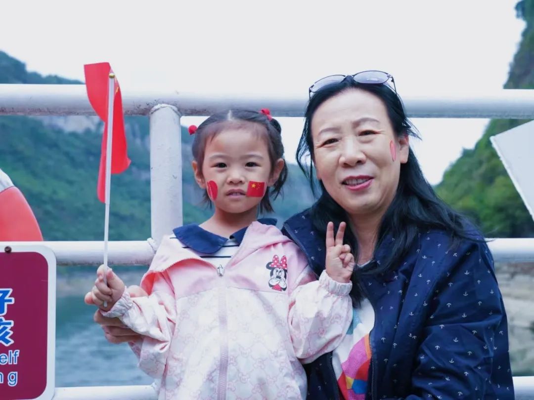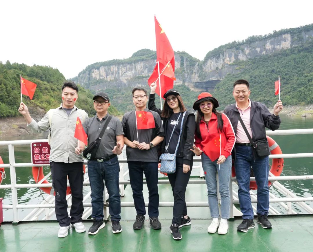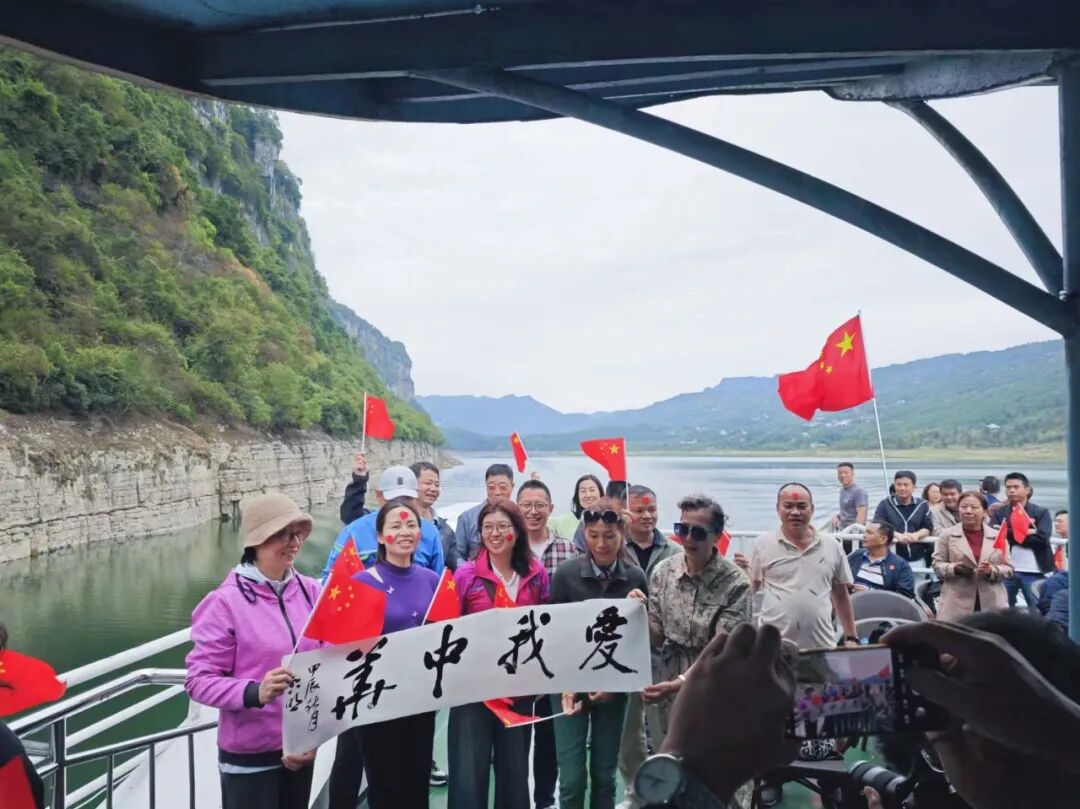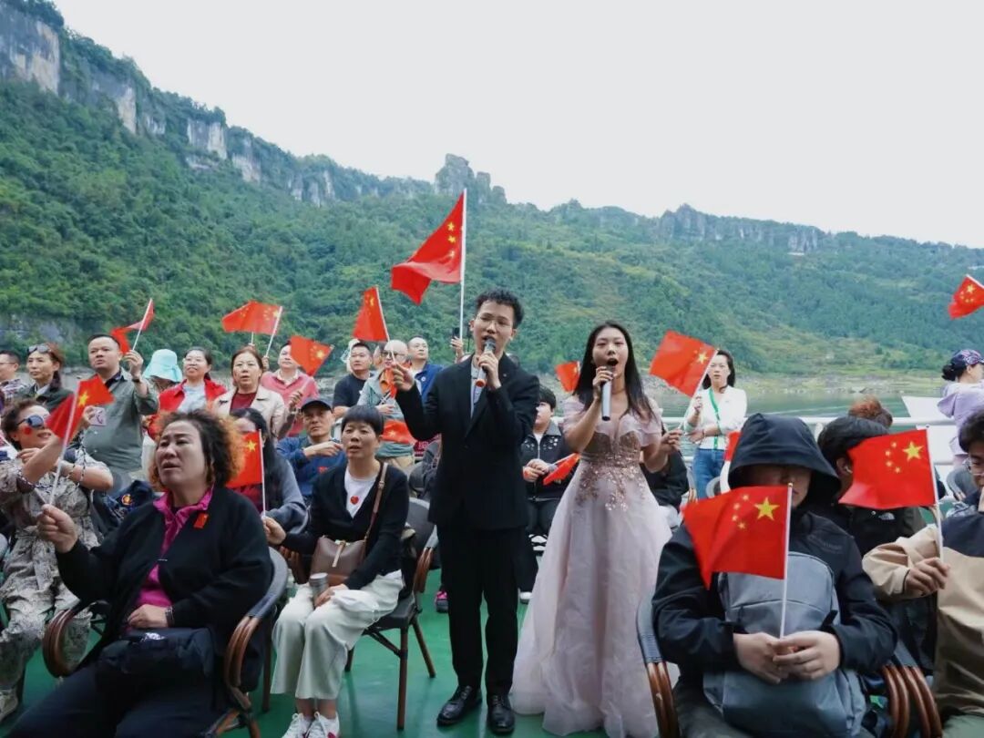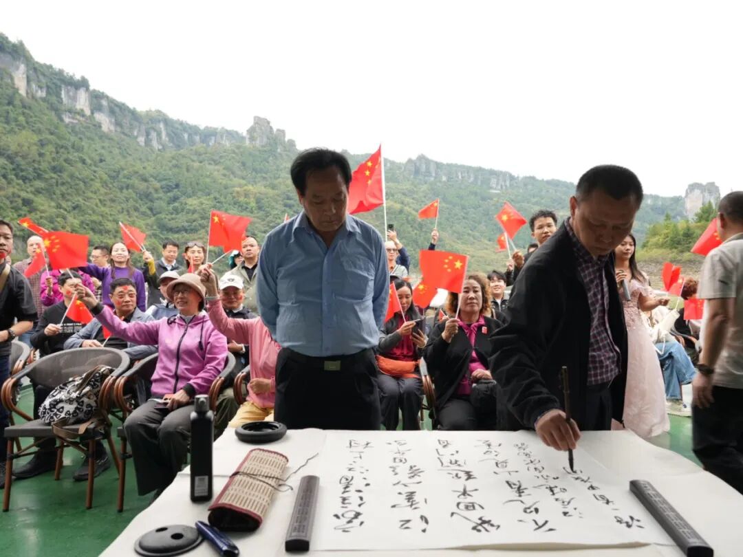 当游船缓缓行驶在清澈的江面上,一场别开生面的毛笔字书写活动正在如火如荼地进行着。凝神静气,手中的毛笔如灵动的舞者,在纸上翩翩起舞,一笔一划,刚劲有力,尽显书法的魅力。游客们纷纷围拢过来,静静地欣赏着老师的创作。墨香在空气中弥漫,与清江的清新气息交织在一起,让人陶醉其中。老师的每一笔画,都仿佛在诉说着对祖国的热爱和对清江美景的赞美。 这里不仅有书法老师挥毫泼墨,以灵动的笔触书画清江之美,更有主持人引领着游客们共同歌唱祖国,为祖国75周年华诞献上最诚挚的祝福。 当主持人那富有感染力的声音响起,号召大家一起歌唱祖国时,游船上的游客朋友们纷纷响应。大家满怀激情,挥舞着手中的五星红旗,齐声高唱《歌唱祖国》。歌声中,人们的脸上洋溢着自豪与喜悦。而在一旁的书法老师仍在专注地书写着,墨香与歌声相互交融,营造出一种独特的节日氛围。景区的自然风光与人文活动完美结合,让每一位游客都沉浸在这难忘的国庆之旅中。 在这里,游客朋友不仅欣赏到了恩施大清江景区的壮美景色,更感受到了中华传统文化的魅力和爱国主义的力量。在这个国庆假期,恩施大清江景区将继续举办更多丰富多彩的活动,同时,景区服务将一如既往地贴心周到。确保游客们在景区度过一个愉快、难忘的国庆假期。