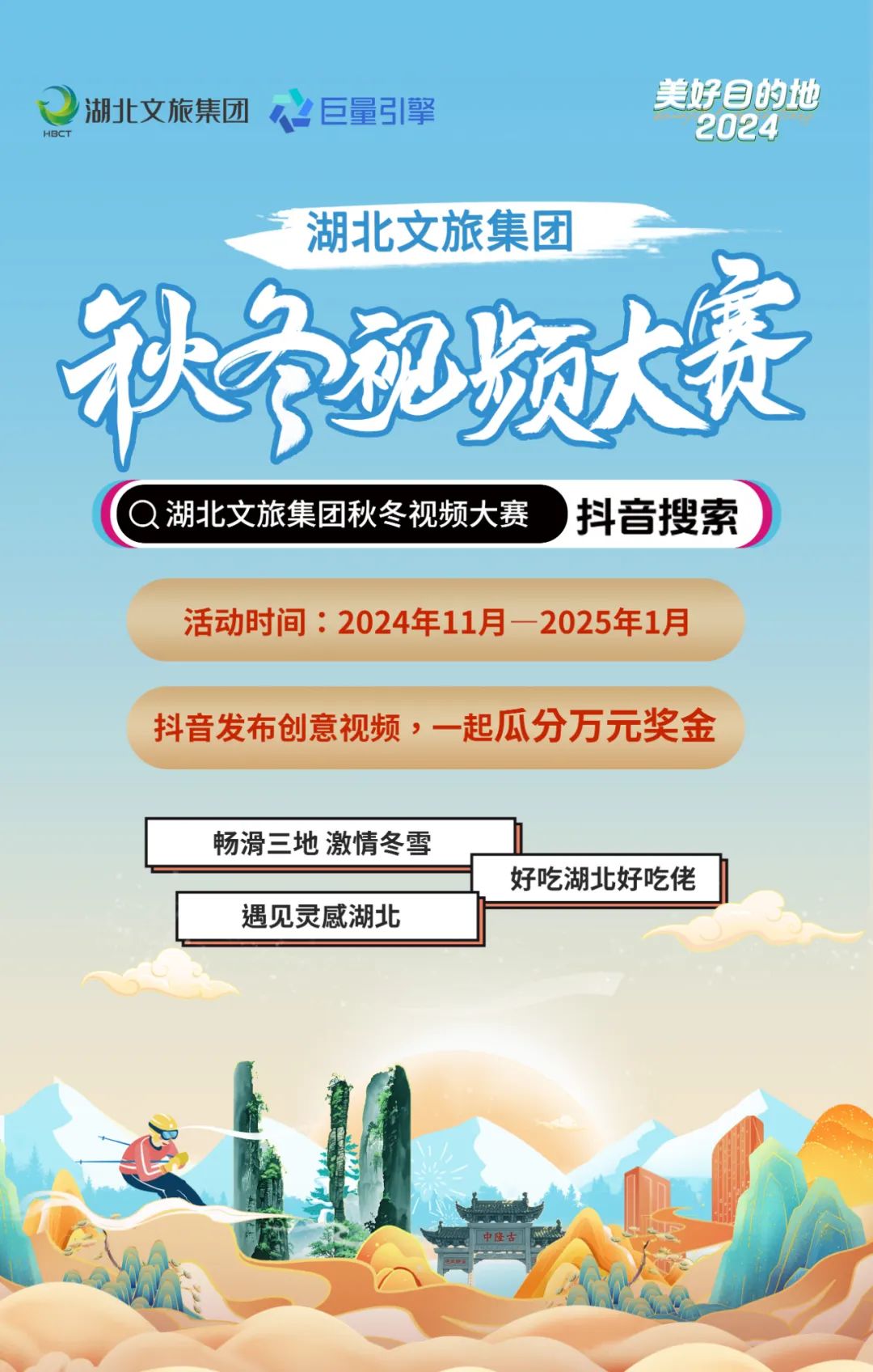 🎁奖项设置 奖项分两个时间段进行评选,以单个视频为评选主体,排名按50%播放量+50%点赞量进行评价;另设景区代言人单项奖。 ⏰时间:活动发布之日起至2024年12月15日 💰奖金设置: 一等奖:设1名,奖1500元现金及价值1000元的门票酒店奖励。 二等奖:设2名,奖700元现金及价值500元的门票酒店奖励。 三等奖:设3名,奖400元现金及价值200元的门票酒店奖励。 ⏰时间:2024年12月15日至2025年1月31日 💰奖金设置:评选整个活动期间前三名平分奖金,共计奖4500元现金及3000元的门票、酒店奖励。 💰景区代言人单项奖:抖音或微信视频号单条视频播放量达100万的,奖励1000元现金,每增加100万元浏览量增加奖金1000元,单条视频奖金封顶10000元。 ◢ Reminder 1、参选作品必须为本人拍摄、剪辑的原创作品,不得盗用、冒用他人作品,凡因未经他人允许擅自盗用作品涉及侵权的,由发布作品本人自行承担相应责任并取消评奖资格。 2、投稿作品默认主办方湖北文旅集团有权使用。 3、参选作品应导向正确,弘扬正能量,传播景区形象特色,不涉及违反国家相关法律、法规的内容,违者自行承担相应责任并取消评奖资格。 4、活动最终解释权归湖北文旅集团所有。