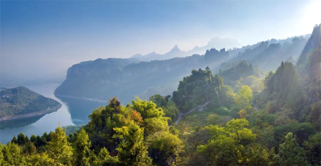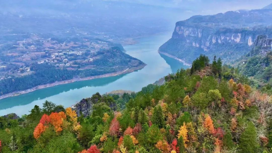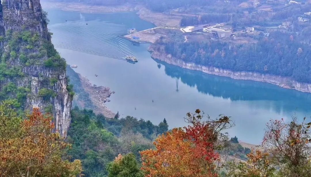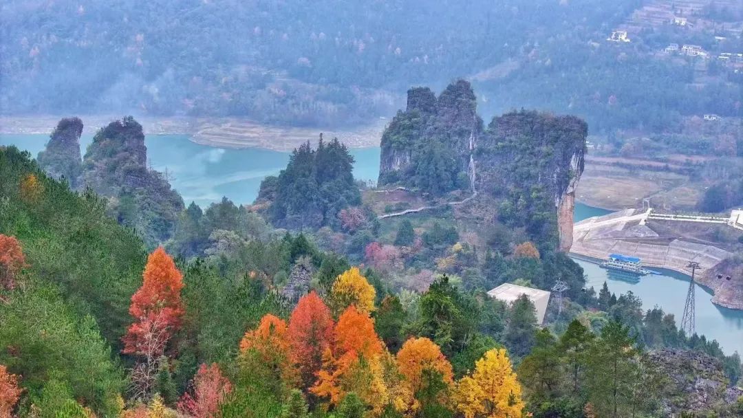 清江江水在冬日里静缓流淌,宛如一条蓝色的绸带蜿蜒穿过景区。江水清澈见底,冒着丝丝寒气,与两岸的红黄树叶,为整个景区增添了几分灵动之美。