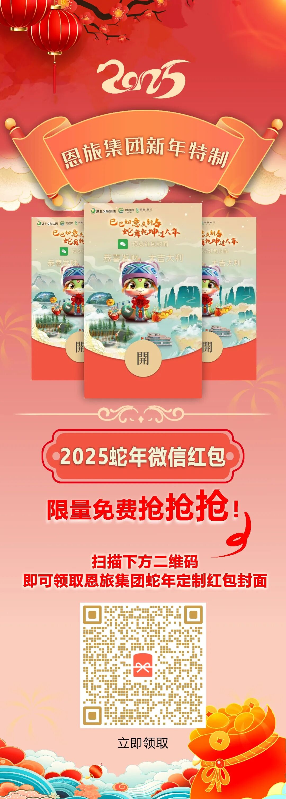 蛇年到,好运到! 恩旅集团蛇年专属红包封面来啦 让你蛇年换新颜 数量有限,赶快来领取吧~ 扫描海报下方二维码 领取恩旅集团蛇年限定红包封面 愿你在新的一年 万巳如意,福来运转!