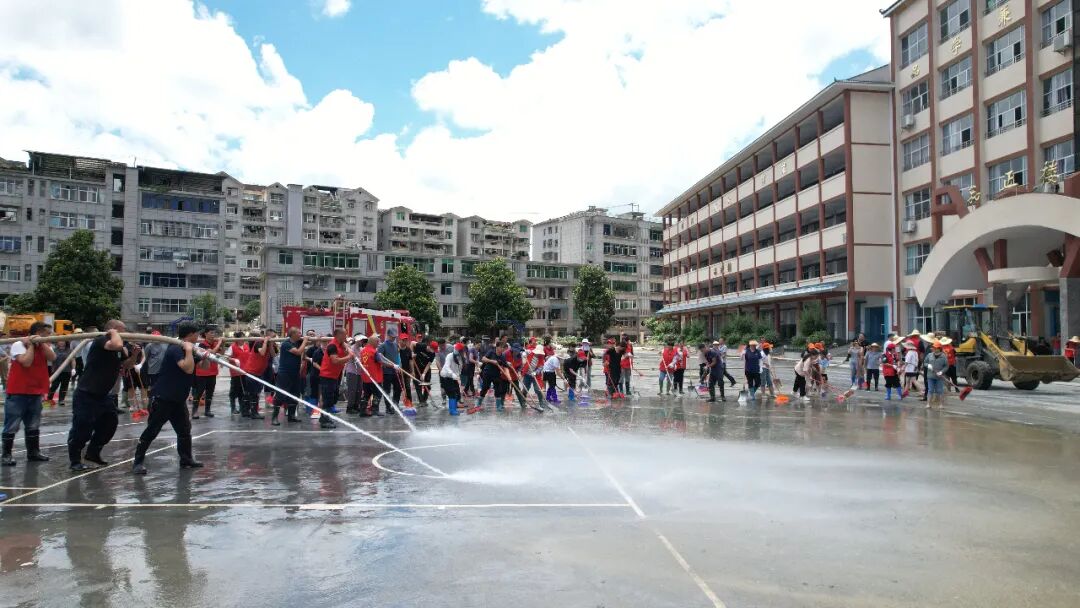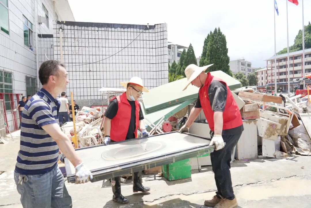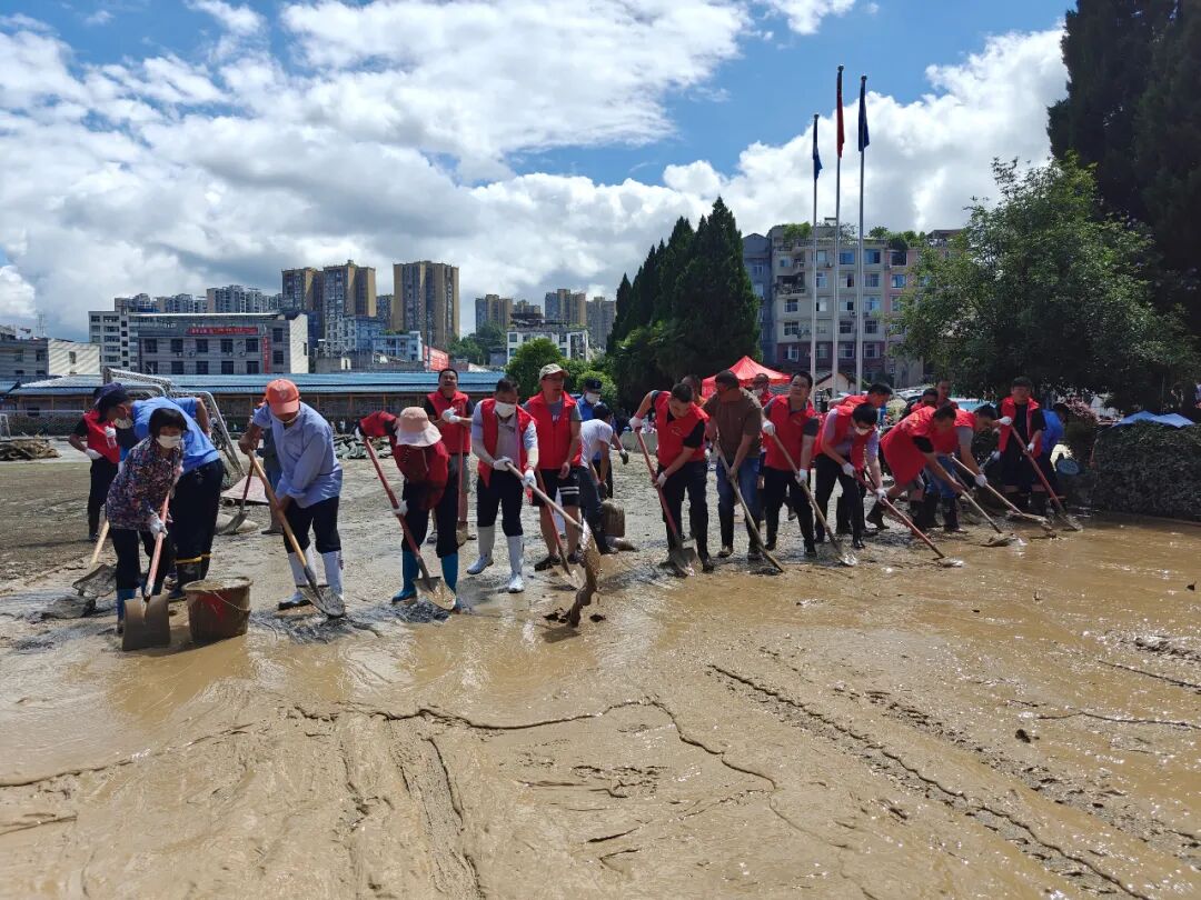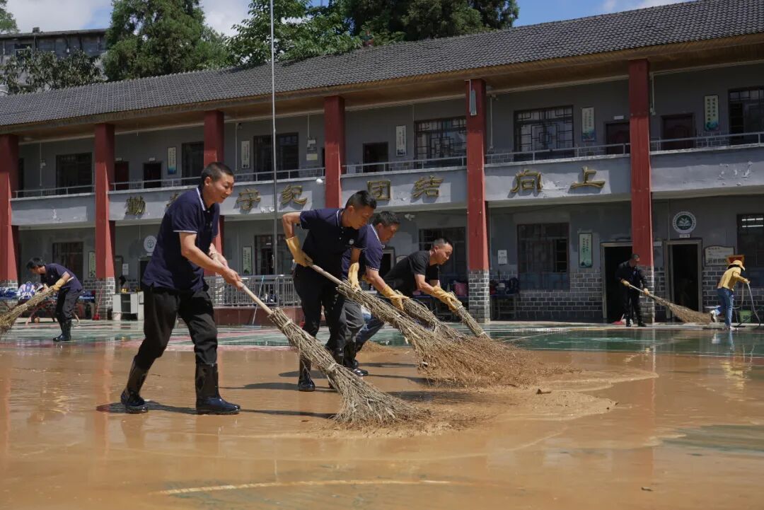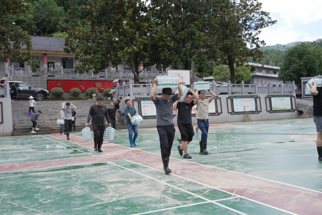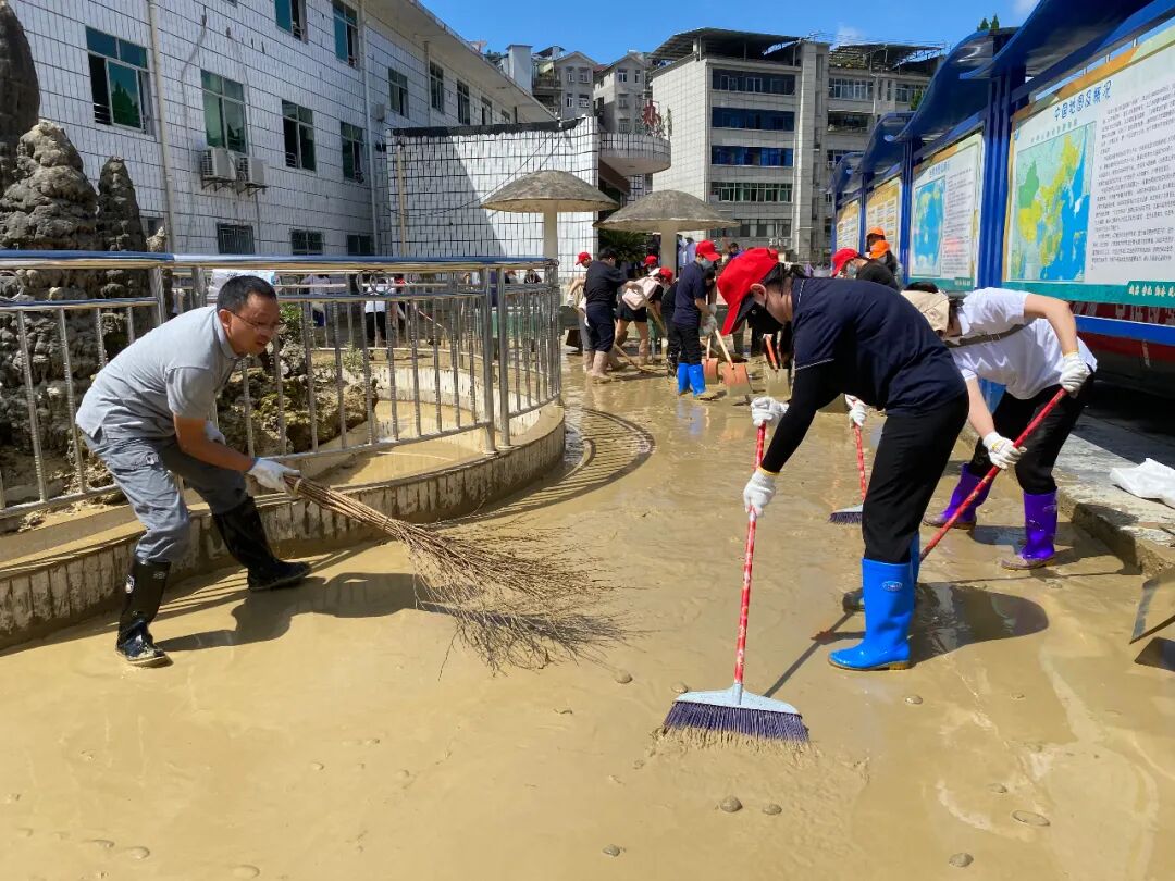 7月2日清晨,恩旅集团党委班子率队奔赴咸丰县第二实验小学、咸丰县民族实验小学、咸丰县高乐山镇小模小学参与救灾工作。同时,大峡谷景区向咸丰县第二实验小学捐赠的500箱矿泉水也同步运抵。抵达后,救援队伍迅速与当地政府、消防、社区等救援力量形成合力,将救援重点聚焦于学校复课前的清理工作。在受灾最严重的咸丰县第二民族实验小学,积水曾一度漫至1.5米,教室与操场被厚厚的淤泥完全覆盖。救援队员们顾不上舟车劳顿,手持铁锹、扫帚等工具,弯腰弓背,一点一点铲除淤泥。