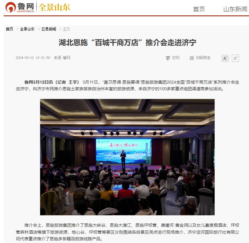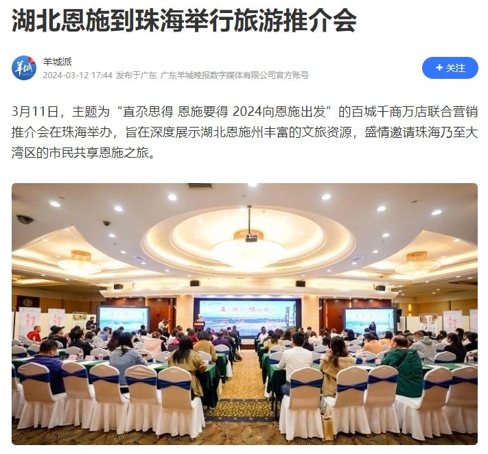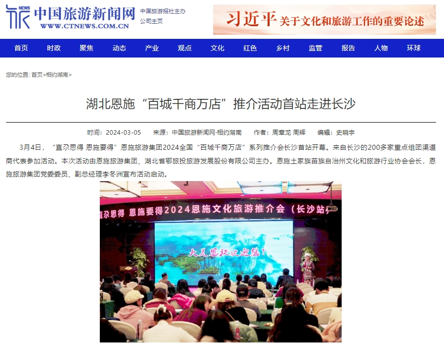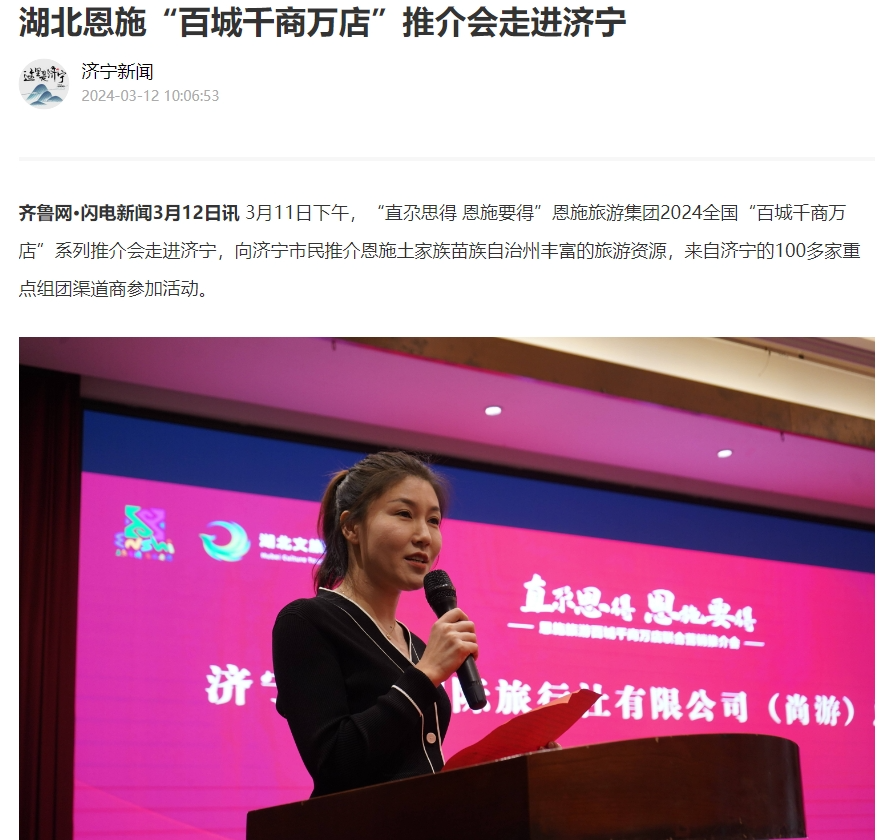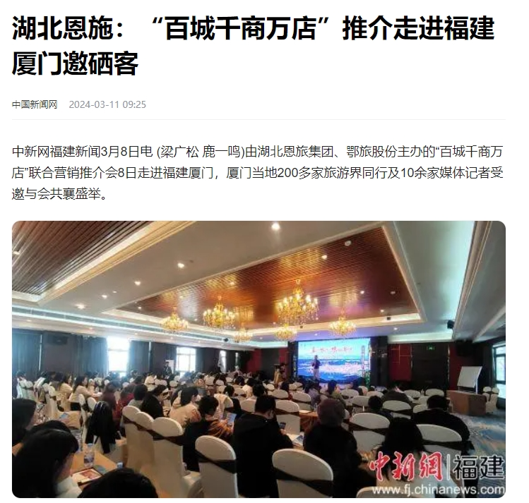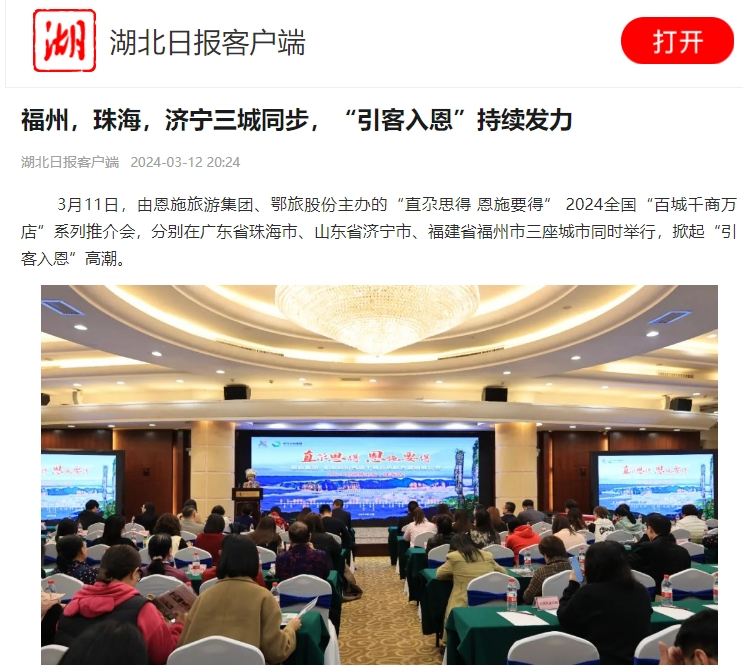 连日来,由恩施旅游集团、鄂旅股份主办的“直尕思得 恩施要得” 2024全国“百城千商万店”系列推介会,相继在长沙、益阳、广州、深圳、厦门、泉州、福州、珠海、济宁、温州、南宁、威海等多座城市成功举办。