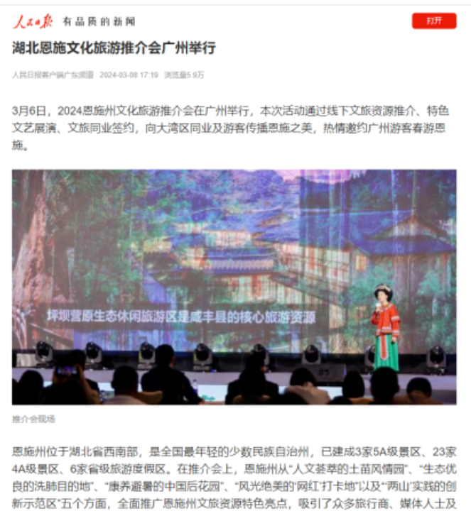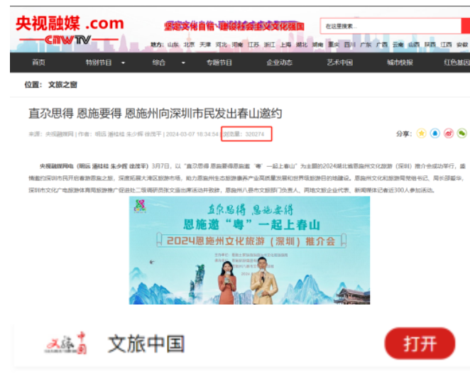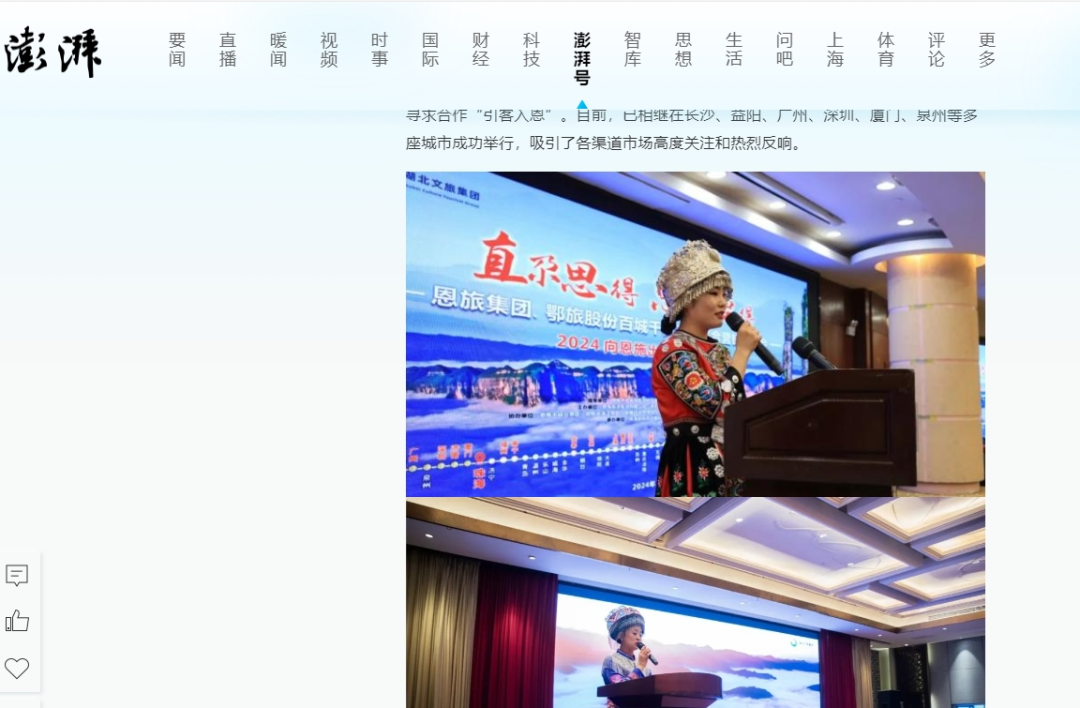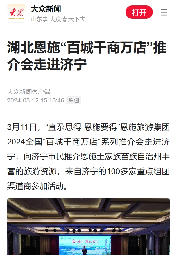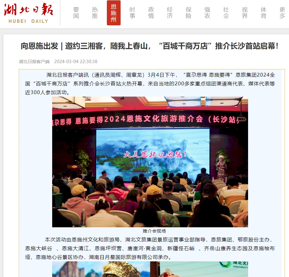 同时,各与会嘉宾不仅充分利用微博、微信、抖音、快手等媒体平台自主扩大宣传,微信朋友圈单个最高获得4000多点赞。各渠道商和文旅同行纷纷表示,要把恩施作为旅游目的地纳入线路产品,加大宣传推广力度,不断提升合作层次和水平,让更多人走进恩施、爱上恩施。 据不完全统计,截至目前,各媒体累计发稿100余篇次,关注人次累计超过3000万。 接下来,恩旅集团、鄂旅股份的营销团队还将陆续奔赴成都、重庆、郑州、南昌、大连、哈尔滨、北京、石家庄、兰州、杭州、南京等多个重点客源地城市开展推介会,活动宣传还将持续进行和发酵。
